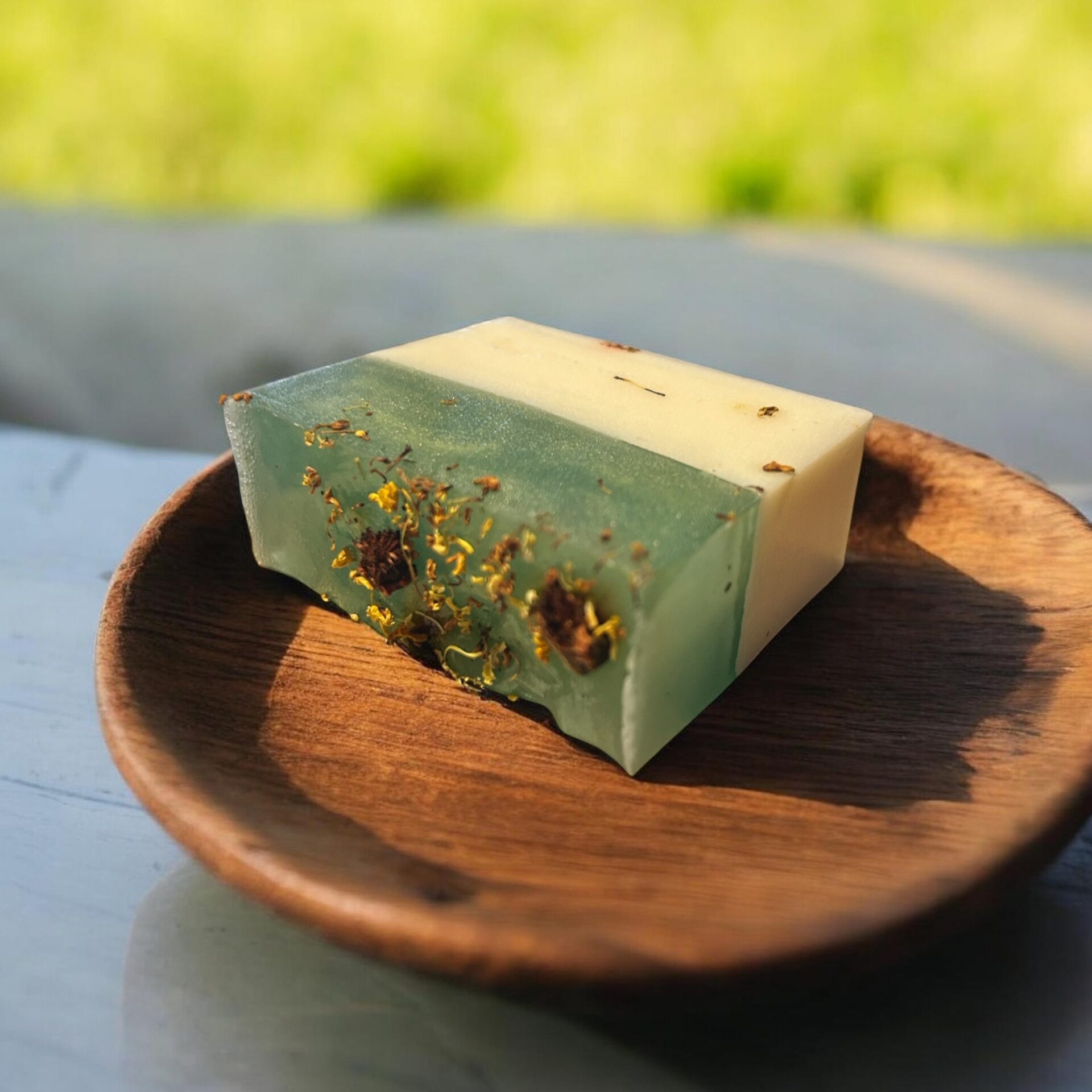 This bar is 1/2 Glycerin and 1/2 Goat Milk, Pressed flower pedals